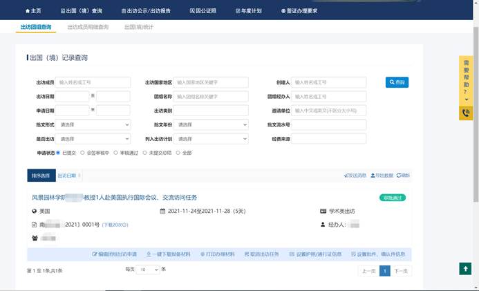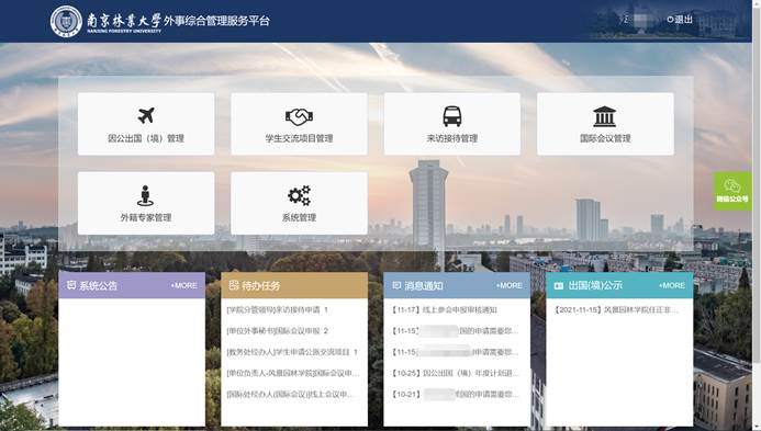 我司為南京林業(yè)大學定制開發(fā)的外事綜合管理服務平臺,包括“因公出國(境)管理”、“學生交流項目管理”、“來訪接待管理”、“國際會議管理”、“外籍專家管理”、“智能證照管理柜”、“系統(tǒng)管理”等模塊。