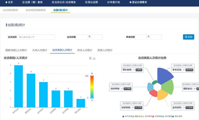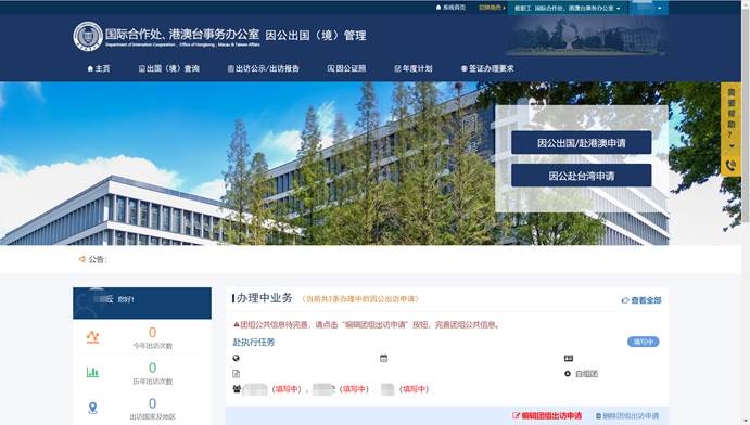 因公出國(境)管理模塊是整個外事綜合管理服務平臺的核心模塊,主要是用于解決學校教職工之前線下繁瑣的出國境手續(xù)辦理工作,提高國際處等管理部門的辦事效率,真正做到“讓數(shù)據(jù)多跑路,老師少跑腿”。因公出國(境)模塊包括:出國(境)年度計劃申報、出國(境)申請、全線上審批、出國(境)公示、行前教育、出訪報告、財務報銷等所有的出國境手續(xù)辦理,以及證照管理、查詢統(tǒng)計等功能。