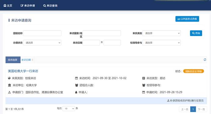 來訪接待管理模塊主要包括學校各種外事來訪的申請(包括校級來訪、院級來訪等)、各部門協(xié)同審批、生成相關表格、提交來訪總結等功能。