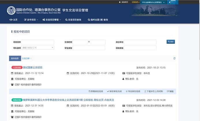學生交流項目管理模塊主要是用于國際合作處發(fā)布學生出國(境)交流項目(國家公派項目、寒暑假短期交流項目、校際交流項目等)、學生線上報名交流項目、各部門線上審批學生的申請。具體包括項目發(fā)布、項目查詢統(tǒng)計、學生報名審核、批量導出學生基礎信息、批量導出學生上傳材料,學生在線申請交流項目、提交交流項目總結、管理員對學生錄取、派出進行管理。