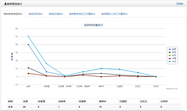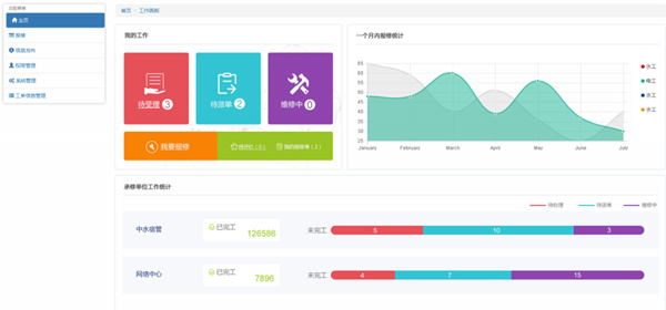 可以根據(jù)報修區(qū)域、報修項目、承修單位、維修工等統(tǒng)計報修量,圖表展示各類報修情況。