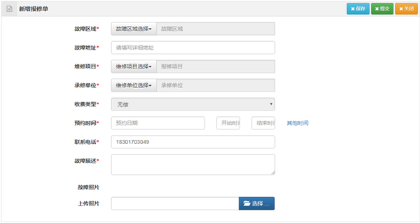 用戶可以在線填寫報修單。包括故障區(qū)域、故障地址、維修項目、預約時間、聯(lián)系電話、故障描述,可以上傳故障照片。用戶也可以電話報修,接到電話后由電話接線員替用戶錄入報修單。