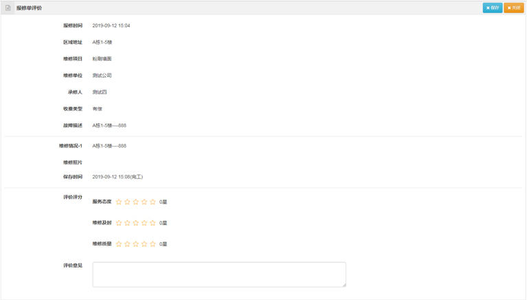維修完工后,報修人可以對本次報修的維修情況進行評價。管理員可設置有哪些評價項目,如:服務態(tài)度、維修及時、維修質(zhì)量等。