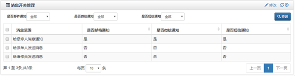 系統(tǒng)在各個環(huán)節(jié)都有郵件、微信或者短信通知,用戶沒登錄系統(tǒng)時也能及時了解預約情況;提交報修單后,系統(tǒng)可給派單人發(fā)送郵件、微信或者短信通知, 提醒派單;派單通過或退回后,系統(tǒng)可給維修服務人員及報修人發(fā)送郵件、微信或者短信告知派單結(jié)果。