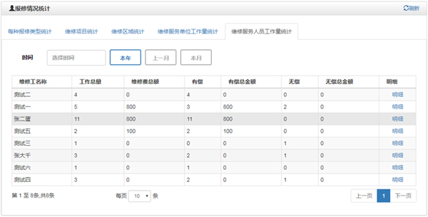 可以統(tǒng)計各個承修單位的工作量、各個維修服務人員的工作量,報修的收費情況等,便于了解維修情況,對各維修服務單位進行考核。