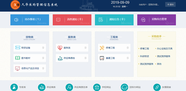 建立全校統(tǒng)一的采購綜合管理信息平臺,包括貨物、服務、工程等,為教職工提供一站式的采購服務,方便師生辦理業(yè)務。通過采購數(shù)據(jù)的實時登記,保證全校采購情況的實時性和有效性,為學校有關部門管理決策提供依據(jù)。
