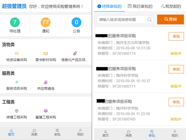 移動端:可通過微信公眾號、移動門戶在手機上進行各類操作,包括對需本人審批的業(yè)務進行審批、查詢本人申請的業(yè)務的審批情況、申購單查詢、消息通知、拍照上傳等操作。