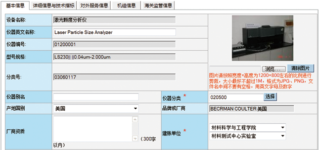 可設(shè)置查詢條件,從資產(chǎn)系統(tǒng)導(dǎo)入大型儀器基本信息;導(dǎo)入后需補(bǔ)充儀器技術(shù)參數(shù)、照片、收費(fèi)標(biāo)準(zhǔn)等數(shù)據(jù),可由校級(jí)管理員、學(xué)院管理員、儀器負(fù)責(zé)人三級(jí)管理,儀器信息補(bǔ)充完整并經(jīng)審核后才可被預(yù)約。