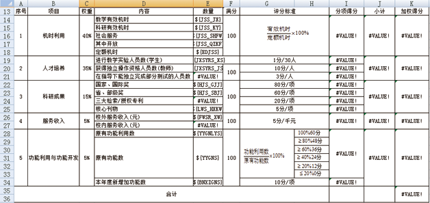 對(duì)儀器負(fù)責(zé)人可錄入儀器的獲獎(jiǎng)情況、發(fā)明專利、發(fā)表論文、人員培訓(xùn)等教研成果;管理員可在EXCEL里設(shè)置各項(xiàng)指標(biāo)的權(quán)重、考核得分計(jì)算公式;綜合儀器的教研成果、使用情況,可計(jì)算儀器考評(píng)得分,進(jìn)行全校排名。